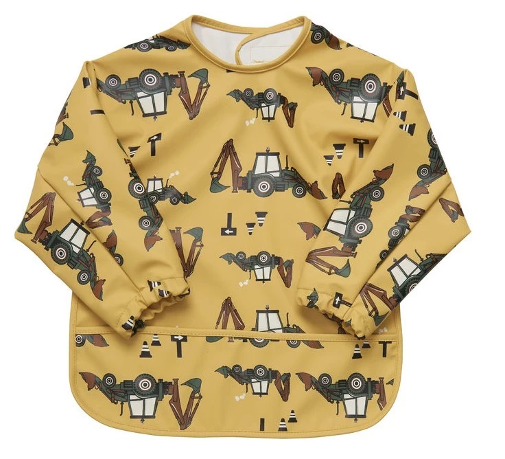 Praktisches Celavi Ärmellätzchen mit langen Ärmeln. Die schöne Farbe maisgelb mit dem Traktormotiv ist ideal für kleine Jungen, die das Essen üben möchten.