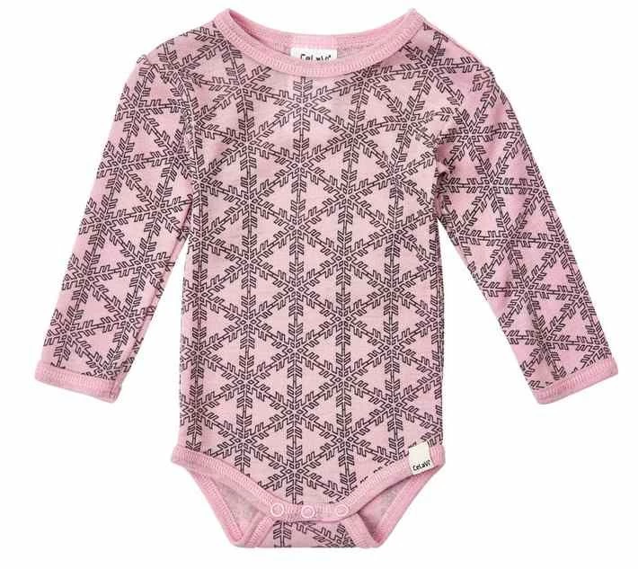 Wärmender Baby Body von Celavi aus fein gestrickter Merinowolle in rosa melange. Mit süßem Allover Schneeflocken-Motiv in schwarz . Prima geeignet zum Drunterziehen unter Outdoorkleidung oder als atmungsaktiver Schlafanzug.