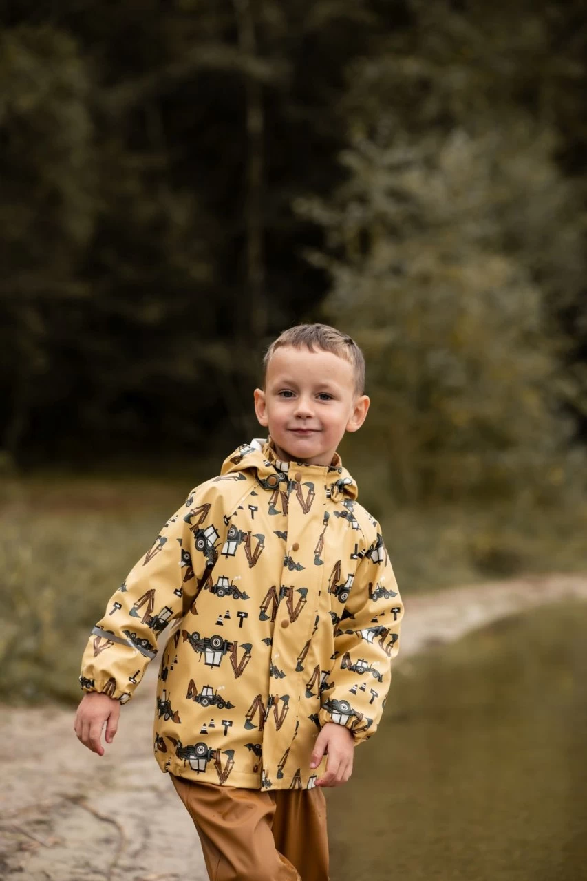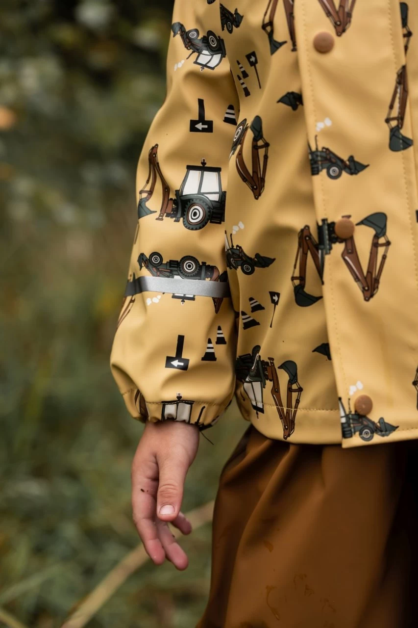Wasserdichtes Celavi Regenoutfit für Kinder. Das strohgelbe Motiv mit dem Baggerlader Traktor gefällt sicher allen kleinen Pfützenspringern. Da kann es Bindfäden regnen – im Celavi Regenanzug können die Kleinen unbeschwert draußen toben und spielen. Das Set besteht aus Regenjacke und schwarzer Regenhose. Ideal für den Kindergarten und Spielplatz. Wasserdicht, bequem geschnitten und klein zusammenlegbar.