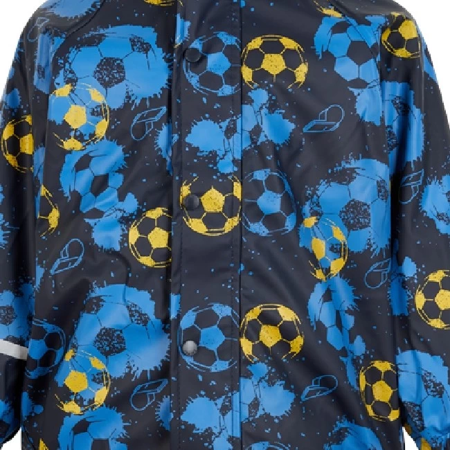 Wasserdichtes 2-teiliges Regenoutfit für Jungen. Das Celavi Regenset in vallerta blau mit einem coolen Fußball-Motiv in blau/gelb gefällt Jungen bestimmt besonders gut. Sogar eine Schiedsrichter Trillerpfeife kann man auf der Regenjacke entdecken. Durch das wärmende Fleecefutter macht draußen Spielen auch bei kaltem Matschwetter Spaß. Im gefütterten Celavi Regenanzug können kleine Pfützenspringer auch in der kühleren Jahreszeit draußen unbeschwert toben und spielen. Das Set besteht aus gefütterter Regenjacke und dazu passender Thermo Regenhose. Ideal für den Kindergarten und Spielplatz. Wasserdicht, bequem geschnitten und klein zusammenlegbar.
