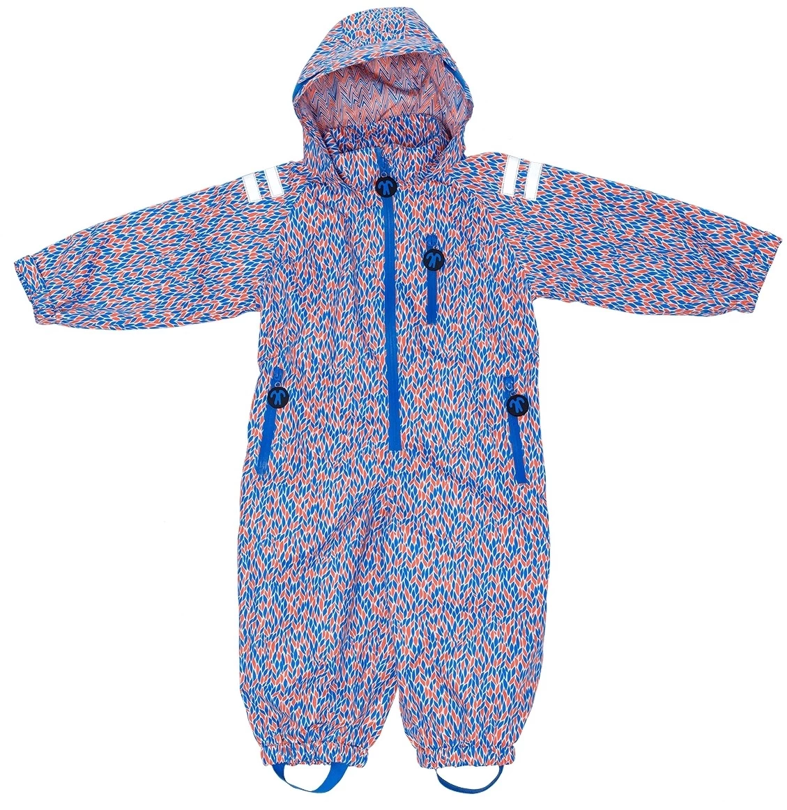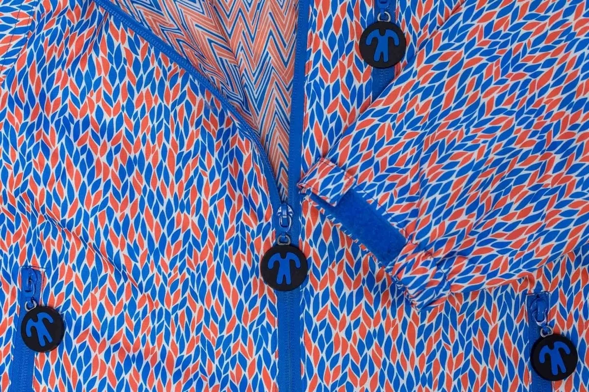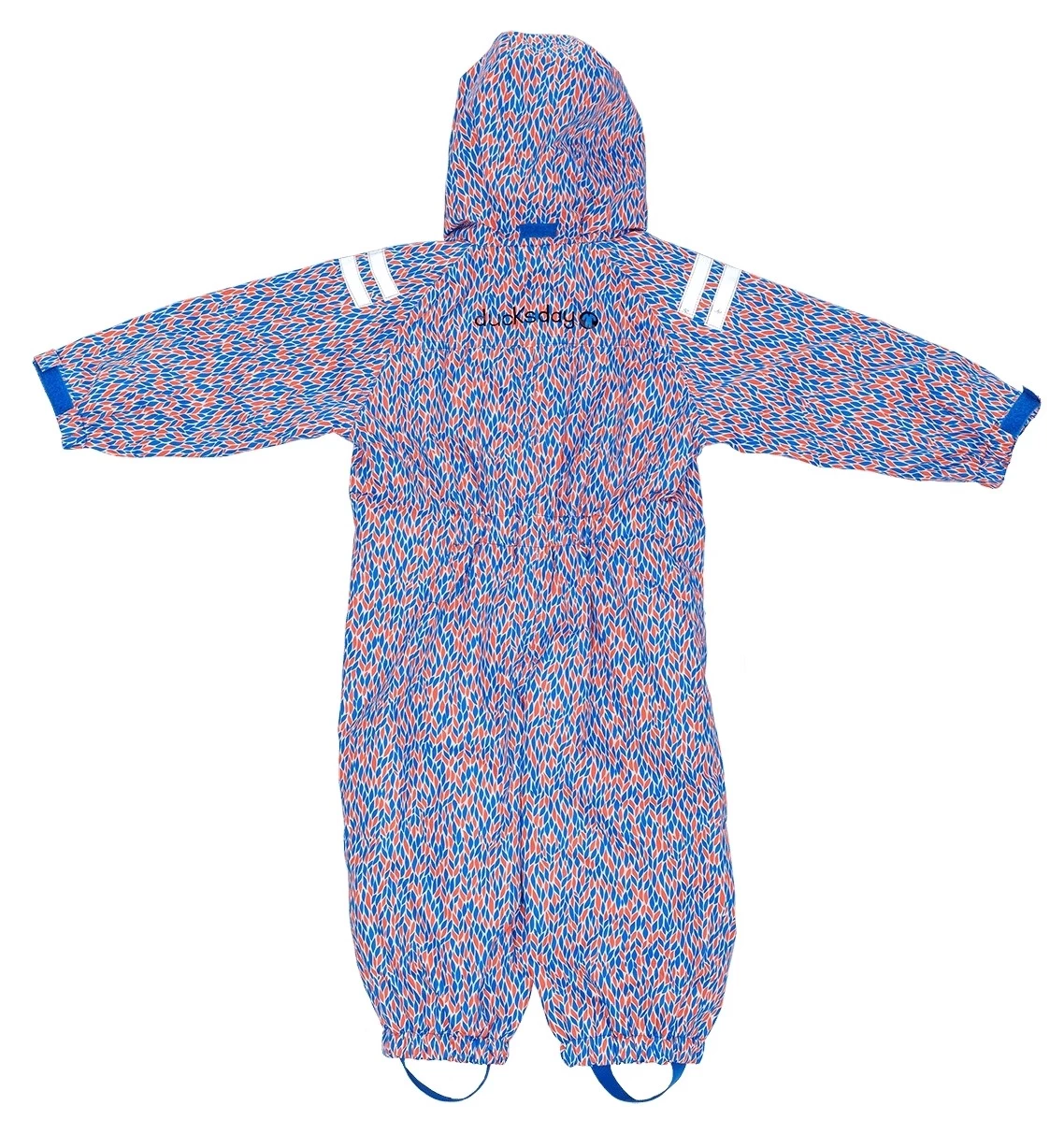 Praktischer wasserdichter Matschoverall von Ducksday. Der Regenanzug Joy hat ein schönes Muster in blau/orange. Der ideale Regenoverall zum Drüberziehen als Schmutz und Nässeschutz für den Spielplatz, Sandkasten, Kindergarten oder zum Fahrradfahren.