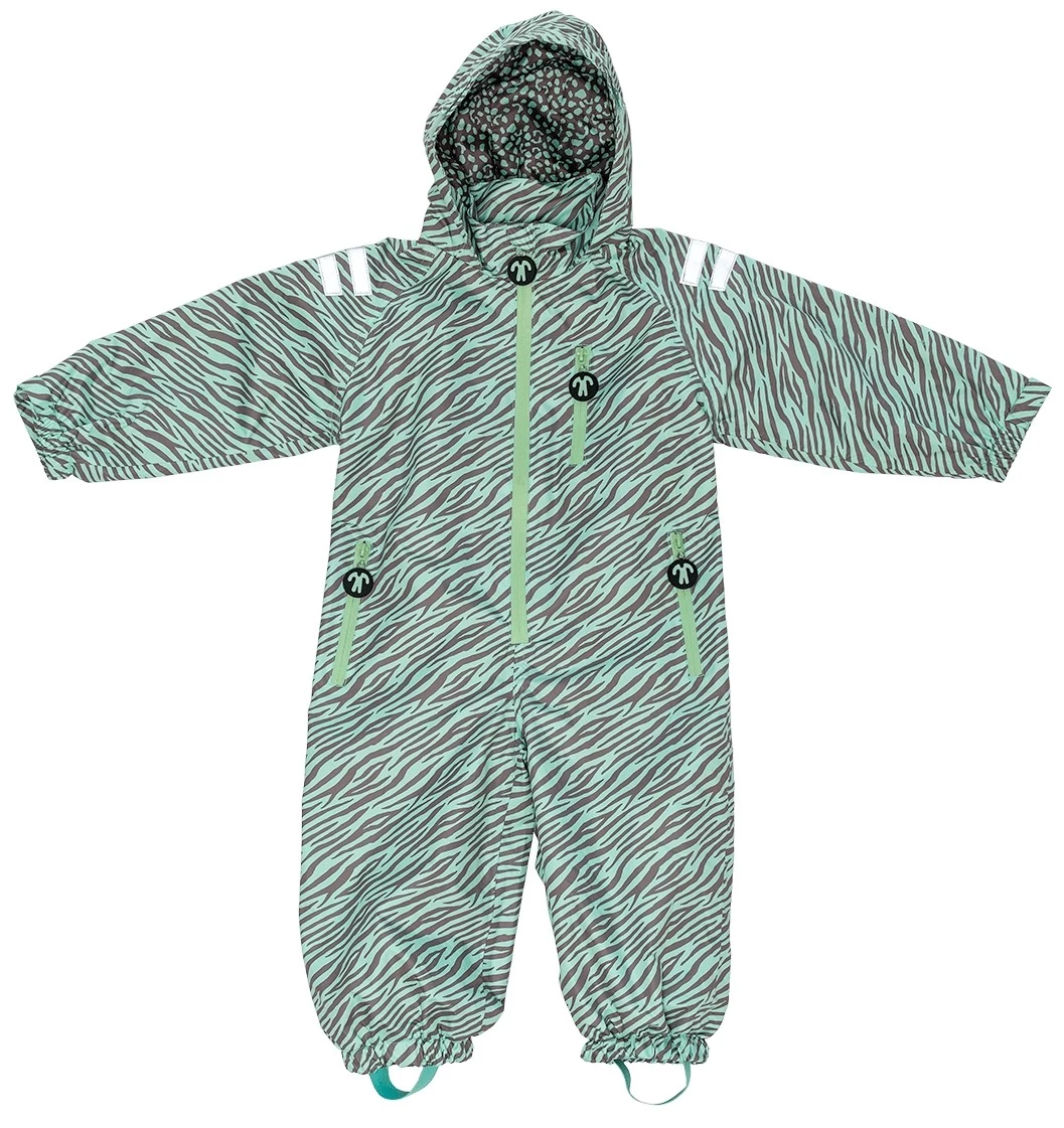 Praktischer wasserdichter Matschoverall von Ducksday. Der Regenanzug Okapi hat ein schönes Muster in zartgrün/braun. Der ideale Regenoverall zum Drüberziehen als Schmutz und Nässeschutz für den Spielplatz, Sandkasten, Kindergarten oder zum Fahrradfahren.