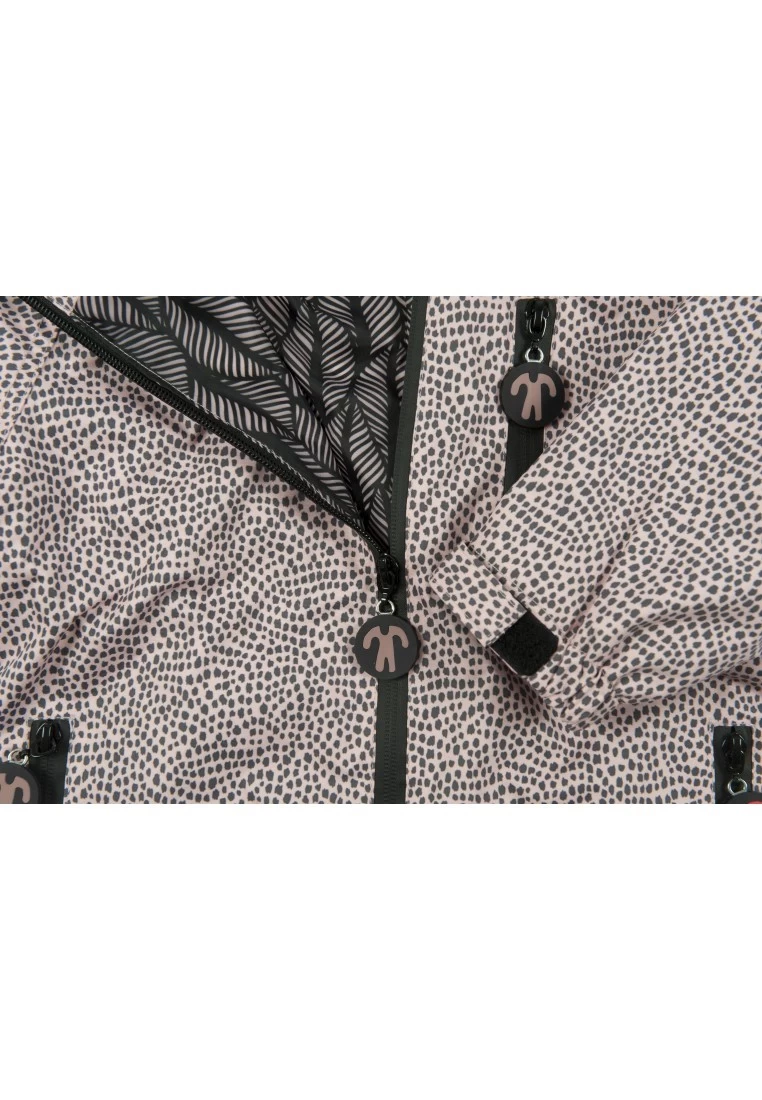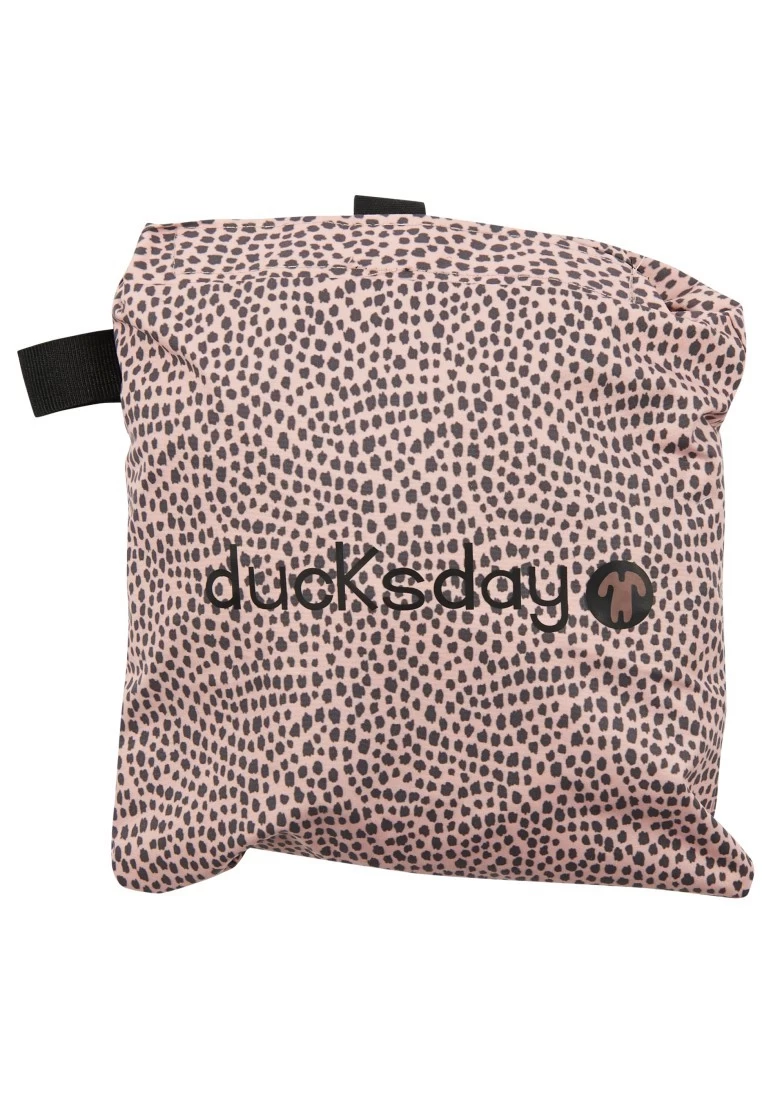 Praktischer wasserdichter Matschoverall von Ducksday. Das Modell June ist in einem rauchigen Rosaton mit einem coolen grauen Fleckenmuster. Der ideale Regenoverall zum Drüberziehen als Schmutz und Nässeschutz für den Spielplatz, Sandkasten, Kindergarten oder zum Fahrradfahren.