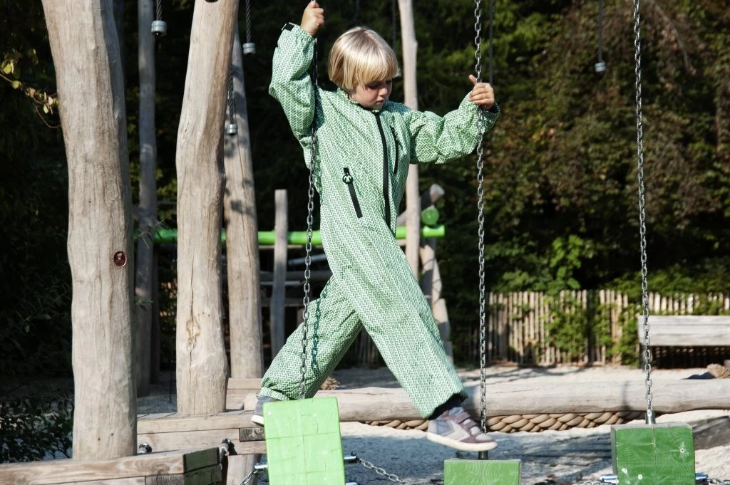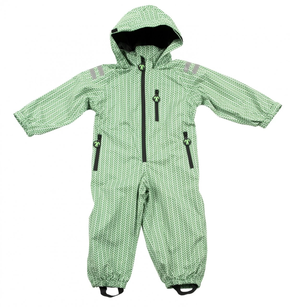 Praktischer wasserdichter Matschoverall von Ducksday. Modell Lex, ein schönes grün mit coolem Muster. . Der ideale Regenoverall zum Drüberziehen als Schmutz und Nässeschutz für den Spielplatz, Sandkasten ,Kindergarten oder zum Fahrradfahren.