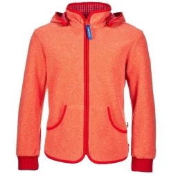 Kuschelige atmungsaktive Mädchen Fleecejacke in grenadine orange. Farblich passende Strickbündchen und eingefassten Saumkanten in rot. Zwei geräumige Einschubtaschen für warme Hände . Die schöne Zip-In Jacke hat eine abknöpfbare Zipfelkapuze ( bis Gr. 110/120 ) Für die größeren Kinder ab Gr. 120/130 ist die Kapuze abgerundet, ohne Zipfel.