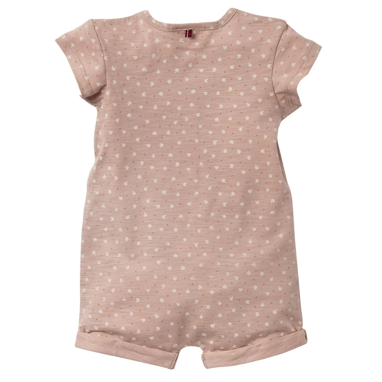 Bequemer detailverliebter Kurzarm Overall mit durchgehender Knopfleiste und All-over-Print auf Grundstofft in der Farbe Rosenholz. Baumwolle aus kontrolliert biologischem Anbau, „organic“ gem. GOTS lizenziert durch Ecocert Greenlife | Liz. Nr. 151811. Hergestellt aus Bio-Baumwolle .