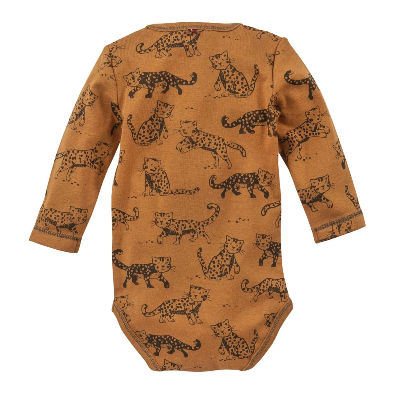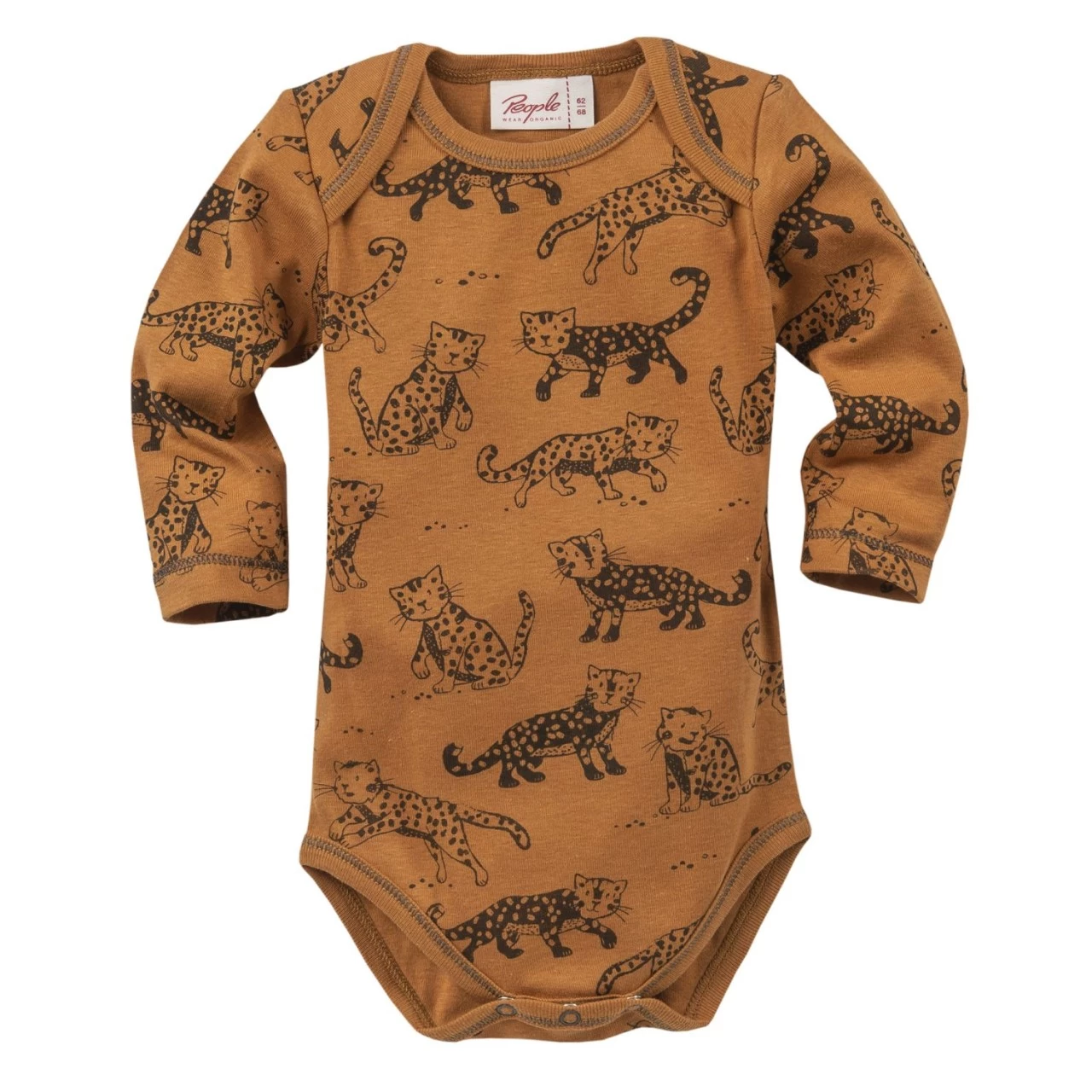 People Wear Organic Langarmbody zimt mit AOP „Schneeleopard“ aus Bio-Baumwolle