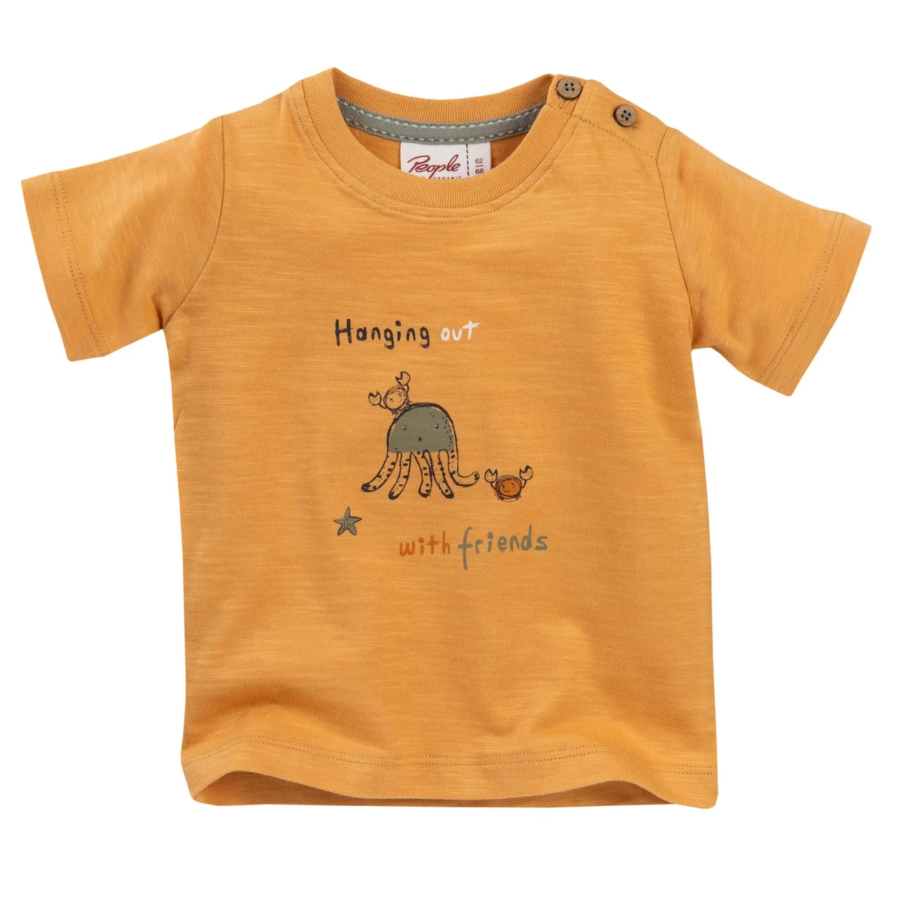 Frisches Design in honiggelb mit mehrfarbigen Motivdruck „kleine Meeresbewohner“ + Schriftzug „Hanging out with friends“. Besondere Optik durch Slub Garn auch Flammgarn genannt, erzielt man eine belebte Optik und eine besonders leichte Stoffqualität. In regelmäßigen Abständen weist das Garn Verdickungen auf, die während des Spinnvorgangs erzeugt werden . Das Material ist 100% Baumwolle , kontrolliert biologischer Anbau, „organic“ gem. GOTS lizenziert durch Ecocert Greenlife | Liz. Nr. 151811.