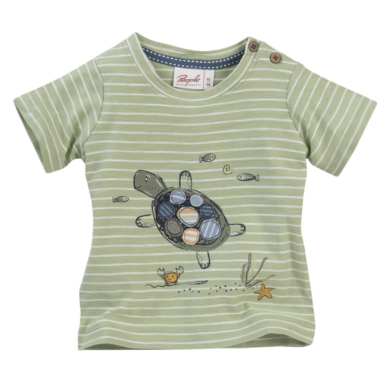 People Wear Organic – Kurzarmshirt lindgrün geringelt mit Applikation „Schildkröte“ aus Bio-Baumwolle
